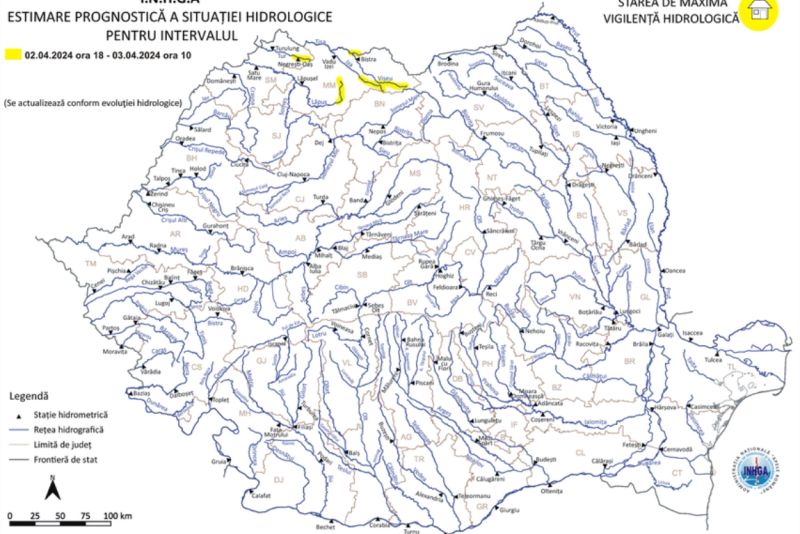 Reprezentanții Institutului Naţional de Hidrologie şi Gospodărire a Apelor (INHGA) au emis, marți, un Cod galben de viituri, valabil pe râurile din nordul ţării. Potrivit hidologilor, atenţionarea este valabilă începând de marţi, de la ora 18:00, și până miercuri, la ora 10:00. În acest interval sunt posibile depăşiri ale cotelor de atenţie pe anumite sectoare de râuri din bazinele hidrografice Tisa, Iza, Lăpuş (judeţul Maramureş) şi Tur (judeţul Satu Mare).