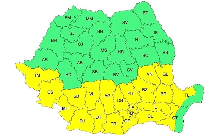 Tot vineri, 2 august, este în vigoare și un cod galben de caniculă în Crișana, nordul Banatului și al Olteniei, nordul și estul Munteniei, jumătatea de sud a Moldovei, Dobrogea, precum și în vestul și sudul Transilvaniei. Disconfortul termic va fi ridicat, indicele temperatură-umezeală (ITU) va depăși ușor pragul critic de 80 de unități. Temperaturile maxime vor fi cuprinse, în general, între 34 și 37 de grade, iar minimele se vor situa în jurul a 20 de grade.