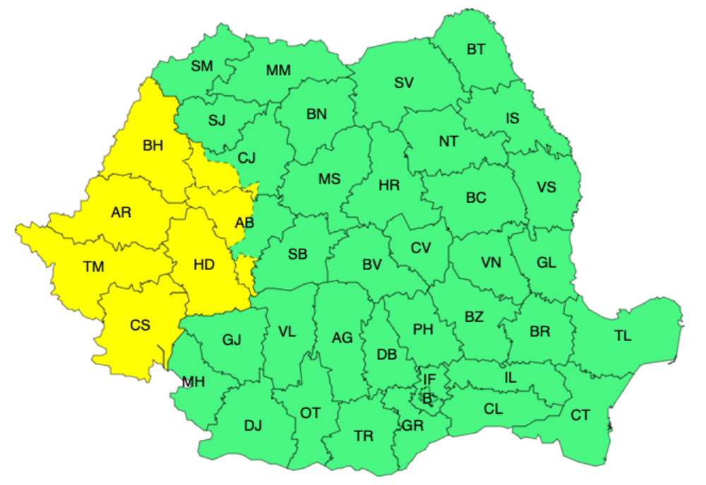 Meteorologii au emis joi o avertizare Cod galben de instabilitate atmosferică accentuată valabilă până la ora 21.00 în șapte județe din vestul țării.