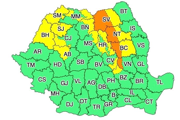 Administrația Națională de Meteorologie a emis atenționări cod portocaliu și cod galben de ninsori viscolite.