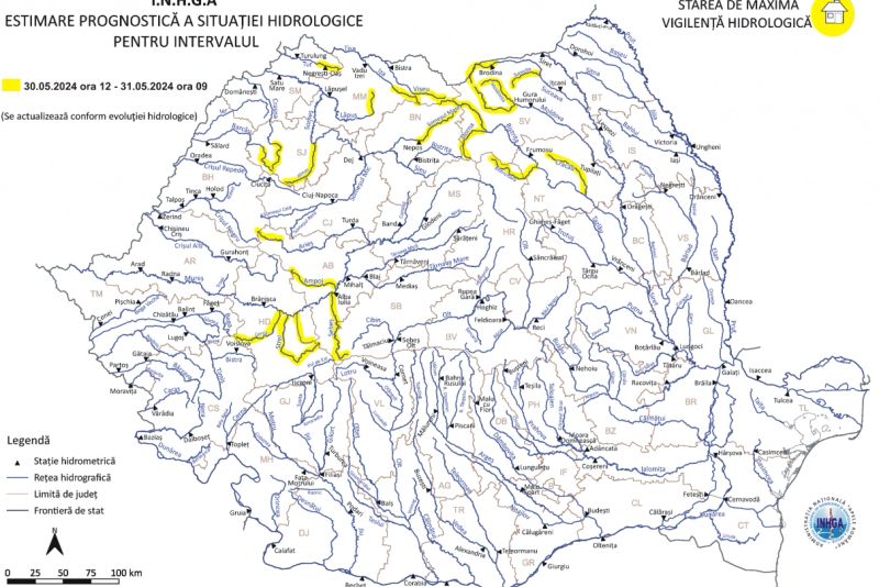 ”Specialiştii I.N.H.G.A. au actualizat Codul galben, cu valabilitate începând de astăzi, de la ora 12:00, până vineri, la ora 9:00. Acesta vizează anumite sectoare de râuri din bazinele hidrografice: Vişeu, Iza, Tur, Someş, Crasna, Barcău, Mureş, Bistriţa, Moldova şi Suceava, în judeţele: Bistriţa-Năsăud, Cluj, Sălaj, Maramureş, Satu Mare, Bihor, Alba, Cluj, Sibiu, Hunedoara, Suceava, Harghita, Neamţ şi Bacău”, a transmis, joi, Institutul Naţional de Hidrologie şi Gospodărire a Apelor.