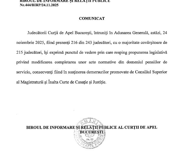 „Judecătorii Curții de Apel Bucureşti, întruniți în Adunarea Generală, astăzi, 24 noiembrie 2025, fiind prezenţi 216 din 243 judecători, cu o majoritate covârşitoare de 215 judecători, îşi exprimă punctul de vedere prin care resping propunerea legislativă privind modificarea completarea unor acte normative din domeniul pensiilor de serviciu, consecvenți fiind în sustinerea demersurilor promovate de Consiliul Superior al Magistraturii şi Înalta Curte de Casație şi Justiție”, a anunțat Curtea de Apel București.
