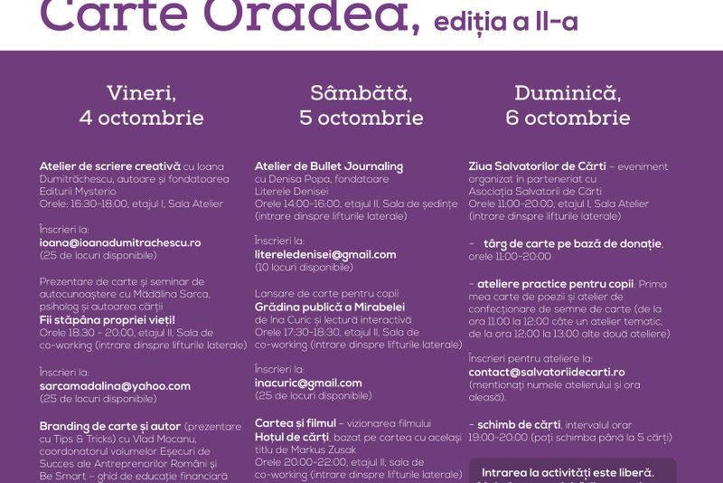 Activitățile au loc în sălile Hub-ului gestionat de Fundația Comunitară Oradea care se află în incinta Crișul Shopping Center. VINERI • Atelier de scriere creativă cu Ioana Dumitrăchescu, autoare și fondatoarea Editurii Mysterio Orele: 16.30-18.00, etajul I, Sala Atelier Înscrieri la: [email protected] • Prezentare de carte și seminar de autocunoaștere cu Mădălina Sarca, psiholog și autoarea cărții Fii stăpâna propriei vieți! Orele 18.30 - 20.00, etajul II, Sala de co-working (intrare dinspre lifturile laterale) Înscrieri la: [email protected] • Branding de carte și autor (prezentare cu Tips & Tricks) cu Vlad Mocanu, coordonatorul volumelor Eșecuri de Succes ale Antreprenorilor Români și Be Smart – ghid de educație financiară pentru liceeni Orele 20.00-21.30, etajul II, Sala de co-working (intrare dinspre lifturile laterale) Înscrieri la: [email protected]ÂMBĂTĂ • Atelier de Bullet Journaling cu Denisa Popa, fondatoare Literele Denisei Orele 14.00-16.00, etajul II, Sala de ședințe (intrare dinspre lifturile laterale) Înscrieri la: [email protected] • Lansare de carte pentru copii Grădina pădure a Mirabelei de Ina Curic cu cerc de poveste interactiv Orele 17.00-18:30, etajul II, Sala de co-working (intrare dinspre lifturile laterale) Înscrieri la: [email protected] • Cartea și filmul – vizionarea filmului Hoțul de cărți, bazat pe cartea cu același titlu de Markus Zusak Orele 20.00-22.00, etajul II, sala de co-working (intrare dinspre lifturile laterale) Înscrieri la: [email protected]Ă • Ziua Salvatorilor de Cărți – eveniment organizat în parteneriat cu Asociația Salvatorii de Cărți Orele 11.00-20.00, etajul I, Sala Atelier (intrare dinspre lifturile laterale) - târg de carte pe bază de donație, orele 11.00-20.00 - ateliere practice pentru copii: Prima mea carte de poezii și atelier de confecționare de semne de carte (de la ora 11.00 la 12.00 câte un atelier tematic, de la ora 12.00 la 13.00 alte două ateliere). Înscrieri pentru ateliere la: [email protected] (menționați numele atelierului și ora aleasă). - schimb de cărți, intervalul orar 19.00-20.00 (poți schimba până la 5 cărți)