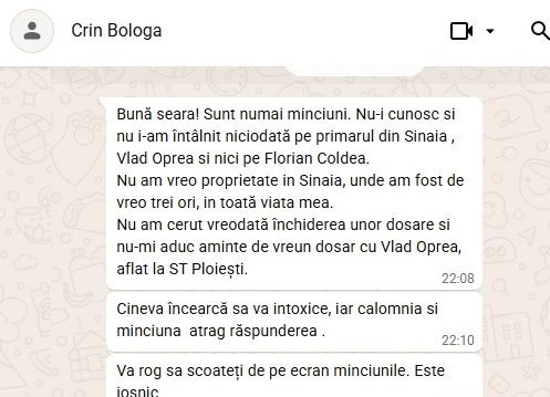 „Nu am vreo proprietate în Sinaia, unde am fost de vreo trei ori în toată viața mea”, a spus Crin Bologa. În legătură cu toate controversele, fostul șef al Direcției Anticorupție afirmă că cineva încearcă să-l calomnieze. „Cineva încearcă să vă intoxice, iar calomnia și minciuna atrag răspunderea”, a mai spus Bologa.