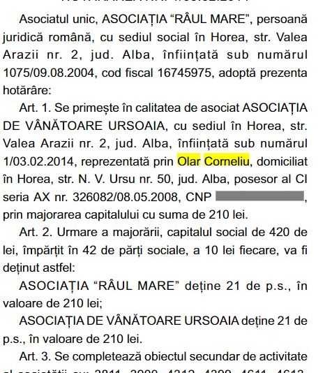 Despre pădurile din Munții Apuseni, rase în mod sistematic s-au scris sute de articole. Tăierile masive din ultimii ani a făcut ca zeci de hectare de pădure să fie transformate pur și simplu în pășuni. Privind de la cel mai înalt pol al județului Alba la limită cu Cluj zonă aflată în administrarea Ocolului Silvic privat Horea Apuseni care se îngrijește de aproape 26.000 de hectare de pădure din cele două județe și coborând pe Valea Arieșului până la Poșaga și Ocoliș găsim mii de metri cubi de lemn tăiați ilegal. Din această mafie de prădători fac parte politicieni, polițiști, oameni de afaceri primari și pădurari.Cum arată schema perfectă a celui mai mare jaf de resursă a țăriiDupă ce în presa locală din Cluj a apărut o informație legată de de un prejudiciu colosal, redacția noastră l-a contactat pe șeful Gărzii Forestiere Regionale de la Cluj, Istrate Stetco care a confirmat că pe raza a cinci comune din Munții Apuseni, în perioada 2007 – 2017 vorbim de peste 140.000 de material lemnos dispărut.” Urmare a unei autosesizări a Gărzii Forestiere Cluj într-o suprafață de fond forestier cu contract de servicii silvice încheiat de către proprietar cu Ocolul Silvic Horea Apuseni SRL, unde am efectuat verificări în teren și am comparat datele înscrise în amenajamentul silvic ediția 2007 cu datele înscrise în amenajamentul silvic ediția 2017, constatând că a dispărut un volum de masă lemnoasă de 142.803 mc, cu o valoare a pagubei de 18.202.610 lei la care se adaugă TVA în valoare de 3.458.496 lei și o valoare a funcțiilor pădurii nerealizate de 12.195.748 lei (calculată la data constatării), iar în acest sens Garda Forestieră Cluj a sesizat unitatea de parchet competentă teritorial și material.” – arată o adresă a Gărzii forestiere.Cireașa de pe tort în această zonă a Apusenilor este Ocolul Silvic Horea Apuseni. Și aici surpriza, unul dintre acționarii ocolului este o asociație de vânătoare din care face parte deputatul liberal Corneliu Olar. De-a lungul anilor, Olar, și-a construit o adevărată filieră de masacrare a pădurilor bazată pe familie, mediul politic dar și frății dubioase cu interlopi ai zonei care au legături directe cu oamenii legii din zonă. Unii taie lemnul în pădure, alți îl transportă, unii se ocupă de documente iar alții îl vând mai departe și totul dispare.Ocolul Silvic Horea Apuseni administrează pădurile comunelor Horea, Albac, Gârda, Vadul Moților și Scărișoara în zona de confluență a județelor Alba și Cluj. În județul Alba, Ocolul Silvic Horea Apuseni SRL are o suprafaţă totală de fond cinegetic de 11.194,38 de hectare și o suprafaţă de arii naturale protejate de 4.420,72 de hectare. În județul Cluj, ocolul respectiv are o suprafaţa totală fond cinegetic de 10.229,78 ha și o suprafaţă de arii naturale protejate de 127,25 de hectare. În total, ocolul silvic privat administrează o suprafață totală 25.972,13 hectare despre care localnicii spun că este fieful familiei deputatului Corneliu Olar.