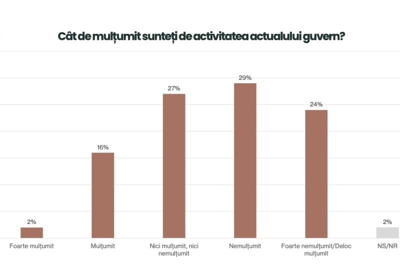 La întrebarea "Cât de mulțumit sunteți de activitatea actualului guvern?", marea majoritate a românilor se declară nemulțumiți sau foarte nemulțumiți.