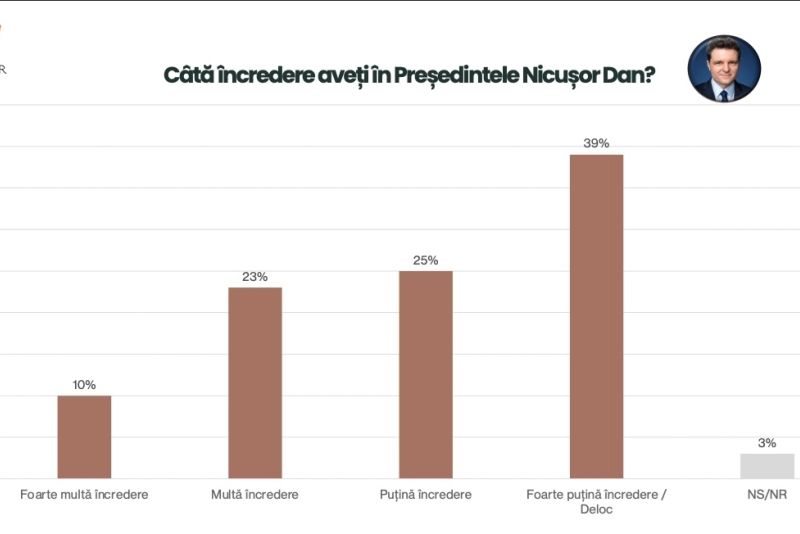 Nicușor Dan nu pare să beneficieze de prea multă încredere nici pe viitor. La întrebarea "Câtă încredere aveți în președintele Nicușor Dan?", 39% dintre români au răspuns: foarte puțină/deloc!