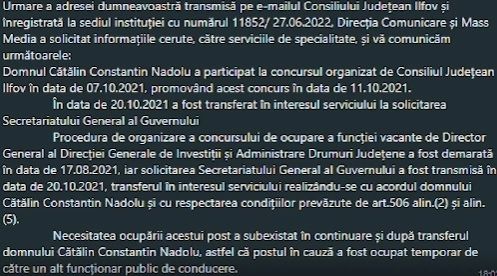 Totodată, CJ Ilfov a transmis și o precizare despre angajarea la Guvern a lui Cătălin-Constantin Nadolu, prin transfer de la CJ, deși era în stare de incompatibilitate. Nadolu a fost pus ilegal în mai multe funcții, a ajuns director general gradul 2 în Secretariatul General al Guvernului (SGG), prin transfer de la Consiliul Județean Ilfov.