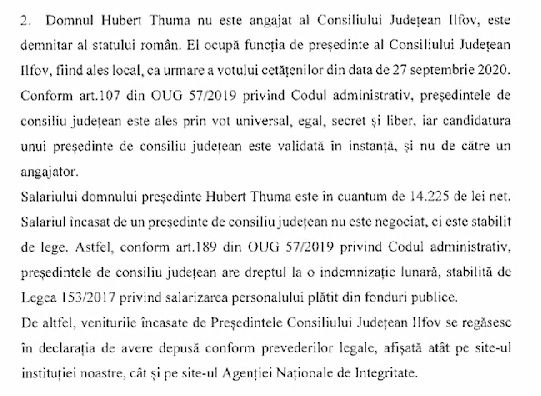În același timp, despre salariul președintelui CJ Ilfov, instituția a menționat că Hubert Thuma nu e angajat al CJ , e demnitar al statului român, presedinte CJ Ilfov, ales prin vot, astfel că salariul său nu e negociat , e stabil.