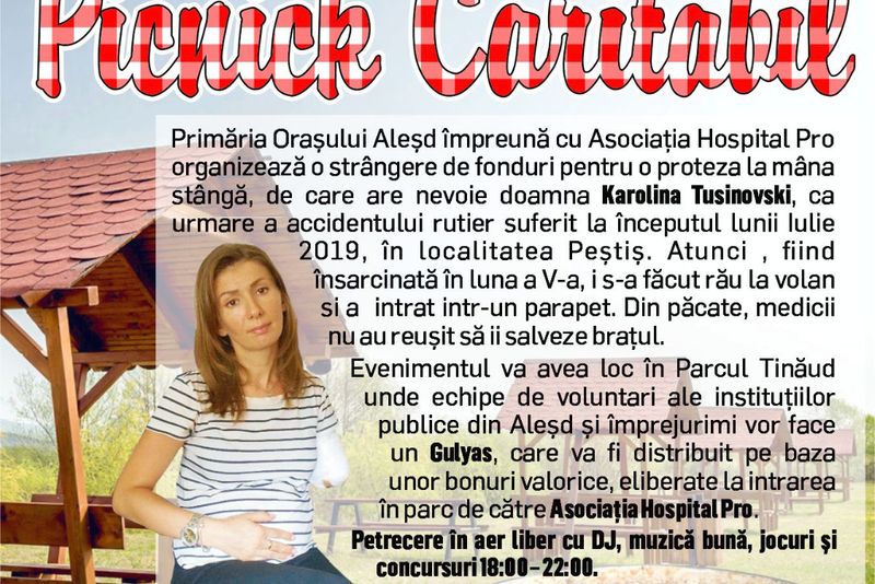 Primaria Orasului Alesd impreuna cu Asociatia Hospital Pro organizeaza o strangere de fonduri pentru o proteza la mana stanga, de care are nevoie doamna Karolina Tusinovski, ca urmare a accidentului rutier suferit la inceputul lunii Iulie 2019, in localitatea Pestis.