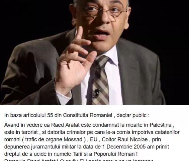 „În baza articolului 55 din Constituţia României, declar public: Având în vedere că Raed Arafat este condamnat la moarte în Palestina şi datorită crimelor pe care le-a comis împotriva cetăţenilor români ( trafic de organe Mossad ), EU, Coltor Raul Nicolae, prin depunerea jurământului militar la data de 1 Decembrie 2005 am primit dreptul de a ucide în numele Ţării şi a Poporului Român! Domnule Raed Arafat! O să fiu EU acela care o sa va ingroape alături de un porc (animal considerat impur în religia musulmană, n.r.) într-un mormânt de Piatră! Te somez să părăseşti acest teritoriu înainte de întâlnirea noastră! Game over zdreamto!”, se arată în mesajul postat de Raul Coltor pe contul său de Facebook.