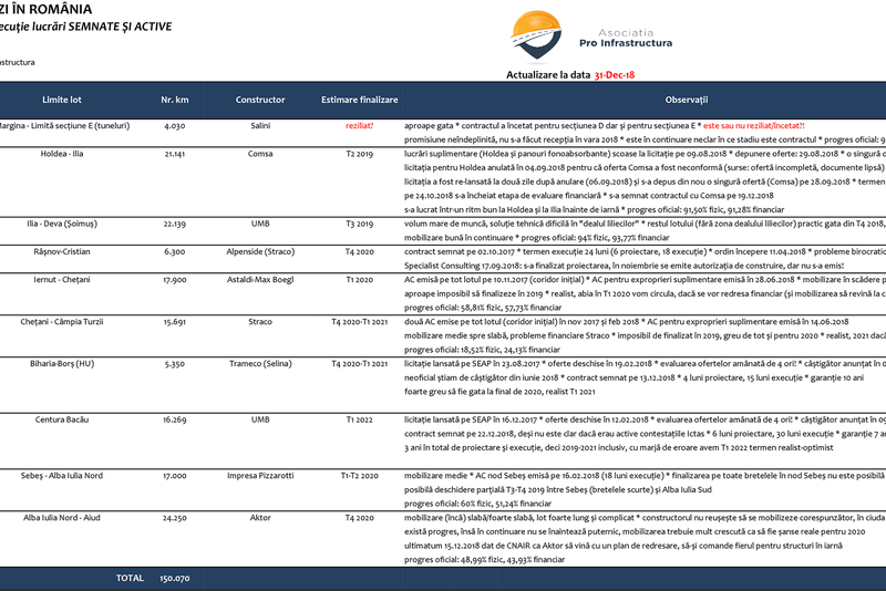 se arată în comunicatul transmis.Aceștia detaliază că folosind rapoartele CNAIR și cifrele bugetului propus, vedem că pe Autostrada A3 Câmpia Turzii-Chețani-Iernut avem nevoie de 462 milioane lei (TVA inclusă) pentru a ajunge la 100% din ambele contracte. Suma alocată de guvern? Doar 164,4 milioane (35,6%) prevăzute pe toată Autostrada Transilvania, între Târgu Mureș și Borș (deși mai sunt și alte mici secțiuni care, teoretic, vor consuma bani).Segmentul din A3 dintre Câmpia Turzii și Chețani (Straco) a ajuns la DOAR 19% stadiu fizic, avansul din 2018 fiind de aproximativ 13%. Din cele 4 proiecte promise de șeful CNAIR, doar tronsonul Chețani-Iernut (Astaldi) are șanse teoretice de finalizare în 2019: este acum la 58%, iar anul trecut a avut un progres consistent de 39 de procente.Similar, pe Autostrada A10 Sebeș-Alba Iulia-Aiud ne trebuie 660 milioane lei (cu TVA) pentru lucrările rămase de executat (și plătit) din cele două contracte. Alocarea? Doar 160 milioane lei (24,2%). Lotul 1 din A10 (Pizzarotti) este la un stadiu fizic de 61%, iar în 2018 a avut un progres de 20%. Sectorul vecin (Aktor) este la 49% și, atenție, în tot anul trecut șantierul "a înaintat" cu doar 5 procente!