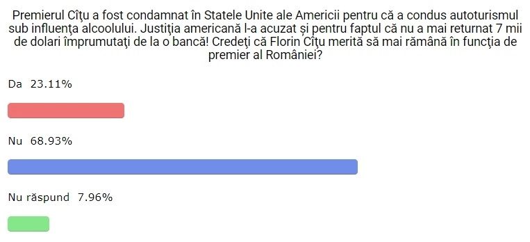 „Premierul Cîţu a fost condamnat în Statele Unite ale Americii pentru că a condus autoturismul sub influenţa alcoolului. Justiţia americană l-a acuzat şi pentru faptul că nu a mai returnat 7 mii de dolari împrumutaţi de la o bancă! Credeţi că Florin Cîţu merită să mai rămână în funcţia de premier al României?”,