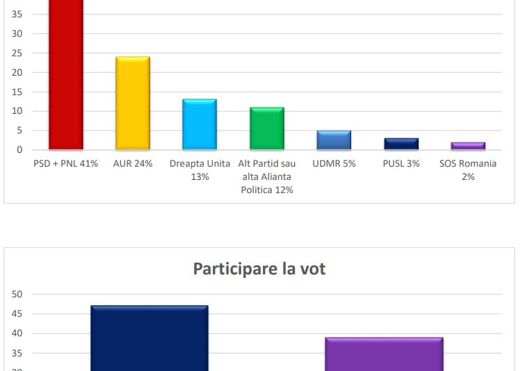 Coaliția PSD PNL conduce într-un sondaj privind opțiunea de vot la europarlamentare, realizat de INSOMAR. Pe a doua poziție se clasează AUR. Analiza arată că mai mulți români vor să participe la vot pentru a-și alege primarii și reprezentanții locali decât la europarlamentare, cele 2 scrutinuri fiind comasate.
