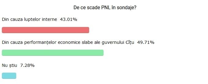 Conform INSOMAR, la întrebarea "De ce scade PNL în sondaje", aproape 50% dintre românii chestionați au răspuns că din cauza performanțelor economice slabe ale Guvernului Cîțu.