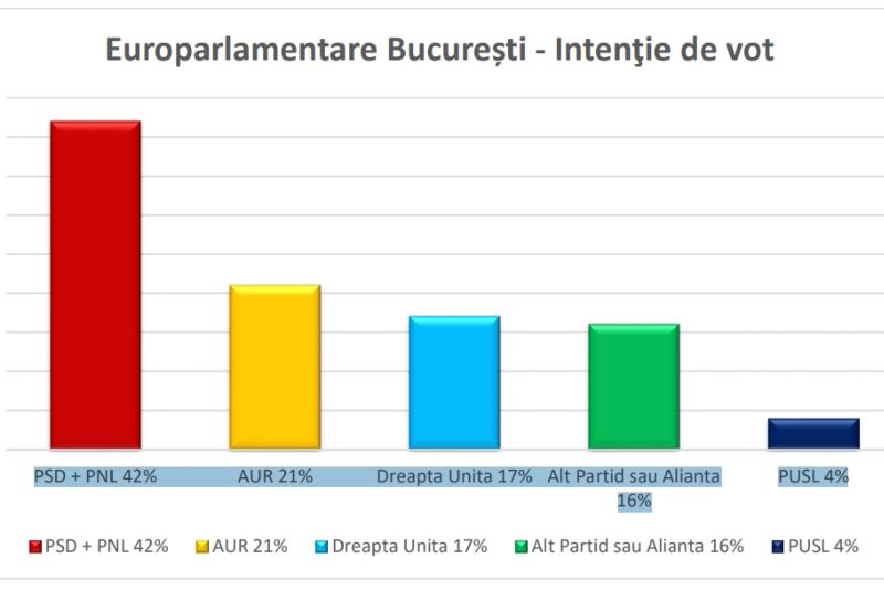 Sondajul mai prezintă și intențiile de vot ale românilor pentru alegerile europarlamentare. La acest capitol, alianța PSD + PNL ar învinge detașat cu 42%, urmată de partidul AUR cu 21%, Dreapta Unita cu 17%, Alt Partid sau Alianta cu 16% și PUSL cu 4%.