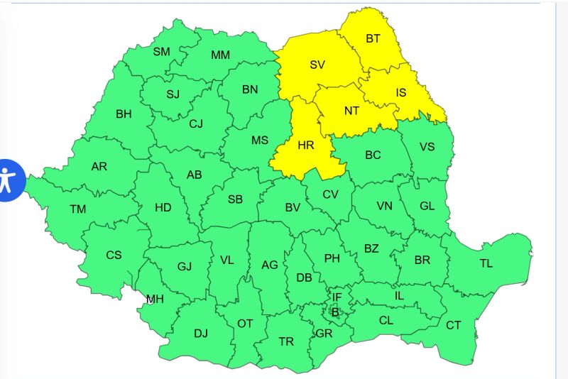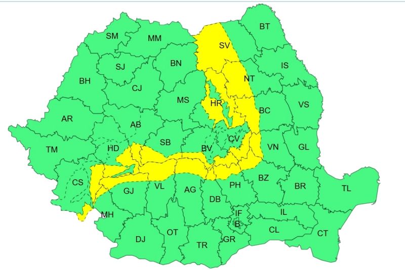 Un alt cod galben este în vigoare pentru nordul Moldovei și estul Transilvaniei, de vineri seara până sâmbătă seara. În această perioadă sunt anunțate temperaturi deosebit de scăzute, cu minime între minus 14 și minus 10 grade. În județele din nordul Moldovei, gerul va continua și ziua, cu maxime în jur de minus 10 grade.