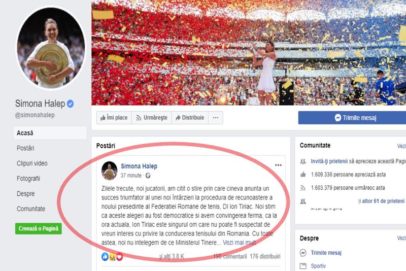 Într-o postare pe Facebook, fostul număr 1 mondial scrie: „Noi știm că aceste alegeri au fost democratice și avem convingerea fermă că, la ora actuală, Ion Țiriac este singurul om care nu poate fi suspectat de vreun interes cu privire la conducerea tenisului din România”.Pe de altă parte, Simona Halep critică și decizia Ministerului Tineretului și Sportului de a nu mai finanța federația de profil: „În timpul în care amânările sunt declarate "mari victorii", proiectele mari pentru copii și juniori sunt oprite pe loc, pentru că statul refuză să le finanțeze”.„Din poziția noastră de promotori ai sportului românesc și ai României, solicităm responsabilitate din partea Ministerului, respectiv reluarea în regim de urgență a finanțării Federației și a programelor sale”, mai spune Simona Halep.