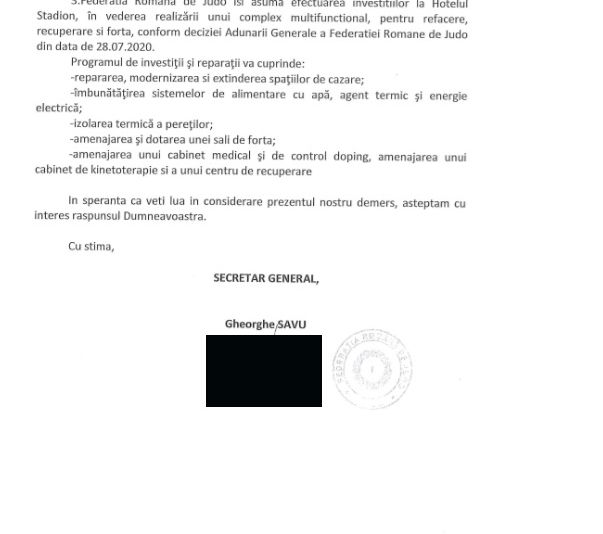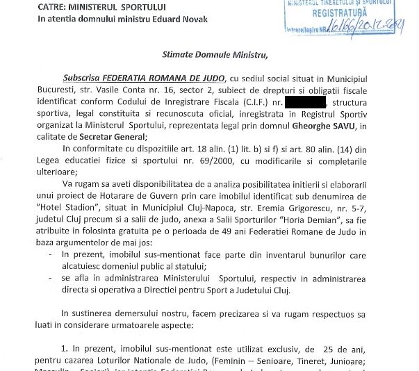 Ministrul Sportului, Eduard Novak, a înțeles, iată, că bazele sportive trebuie să revină la Federații. De decizia ministrului va beneficia și Federația Română de Judo, prin "Hotel Stadion", din municipiul Cluj-Napoca, așa cum reiese din adresele de mai jos: